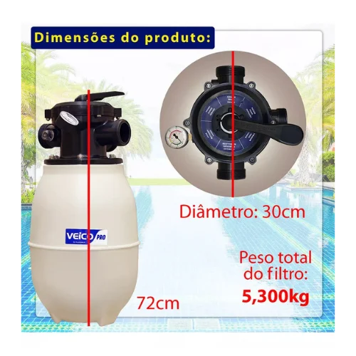- Filtragem Poderosa: O Filtro De Areia Para Piscina Veico V-30 possui alta capacidade de filtração, removendo até as menores partículas de sujeira.