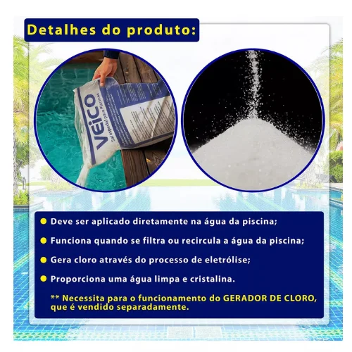 - Consulte o manual do seu gerador de cloro Veico para obter informações específicas sobre a quantidade de sal recomendada.